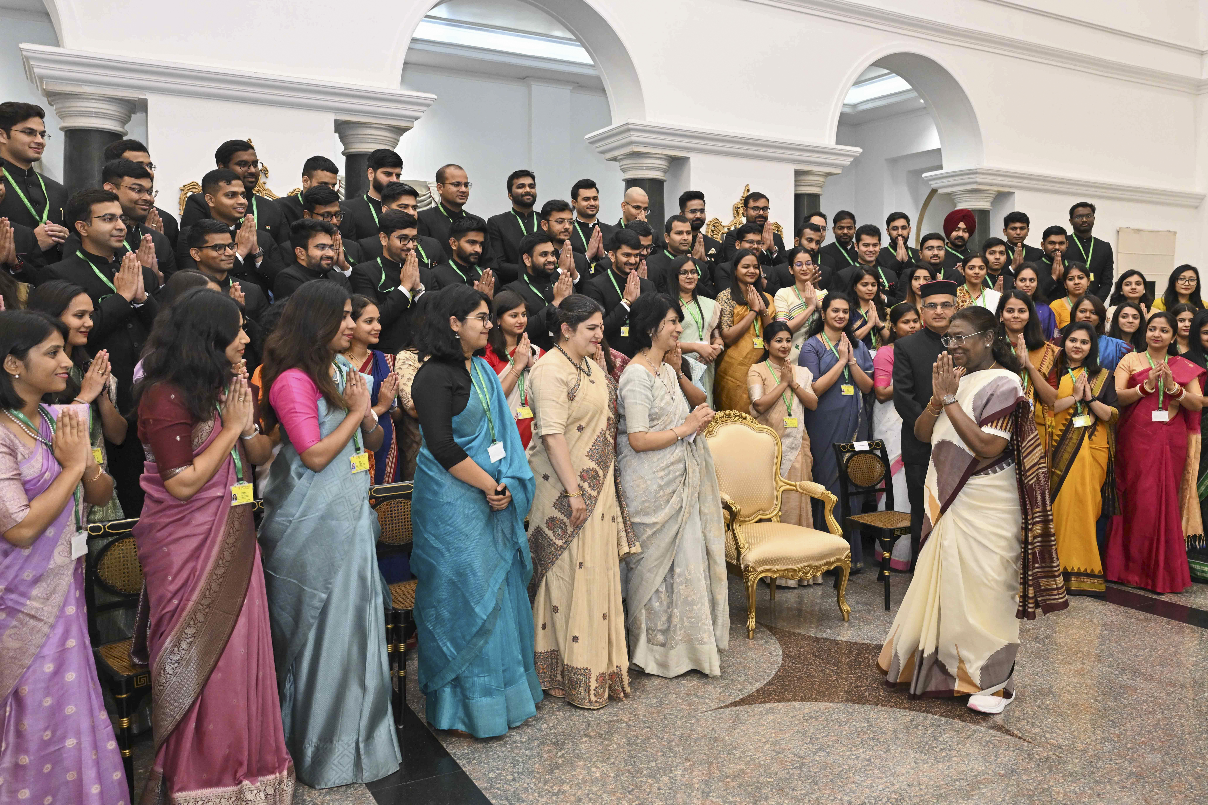 **EDS: THIRD PARTY IMAGE** In this image released by President's office on April 15, 2025, President Droupadi Murmu during an interaction with a group of IAS officers from the 2023 batch, currently serving as Assistant Secretaries in various Union Ministries and Departments, at the Rashtrapati Bhavan Cultural Centre, in New Delhi. (President's office via PTI Photo)(PTI04_15_2025_000106B)