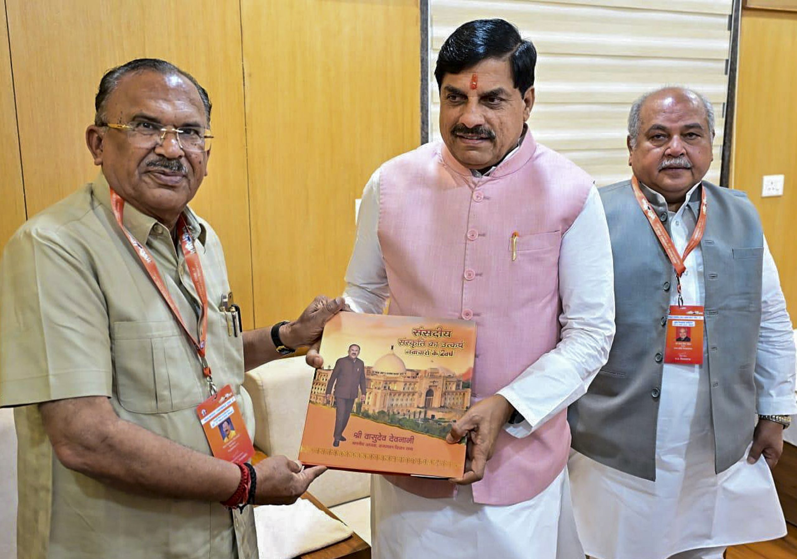 Bhopal: Madhya Pradesh Chief Minister Mohan Yadav, centre, being presented a memento by Rajasthan Assembly Speaker Vasudev Devnani, right, during the inauguration of Youth Legislators Conference, at state assembly in Bhopal, Monday, March 30, 2026. State assembly Speaker Narendra Singh Tomar is also present. (PTI Photo)(PTI03_30_2026_000229B)